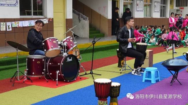 展览会后,小学部和幼儿部的同学齐聚足球场,观看了由洛阳鼓典文化传播有限公司举办的《鼓典打击乐》演奏会。动感的鼓点节奏让活动现场气氛高涨。孩子们的热情尽情挥洒。